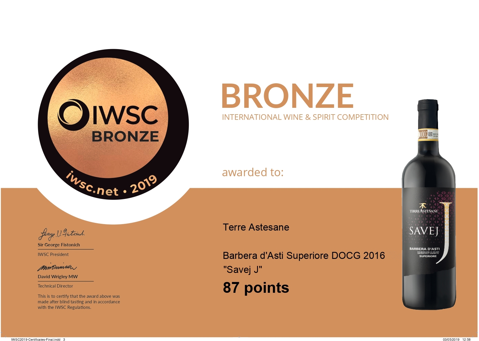 conquistando l'argento e con 87 punti su 100 il nostro Barbera Superiore Savej, salendo sul terzo gradino del podio con la medaglia di Bronzo.